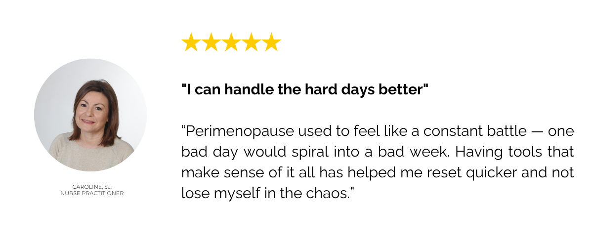 You’re in perimenopause and want to feel emotionally balanced and confident again — without the endless self-help hacks, willpower battles or quick fixes that never seem to last.